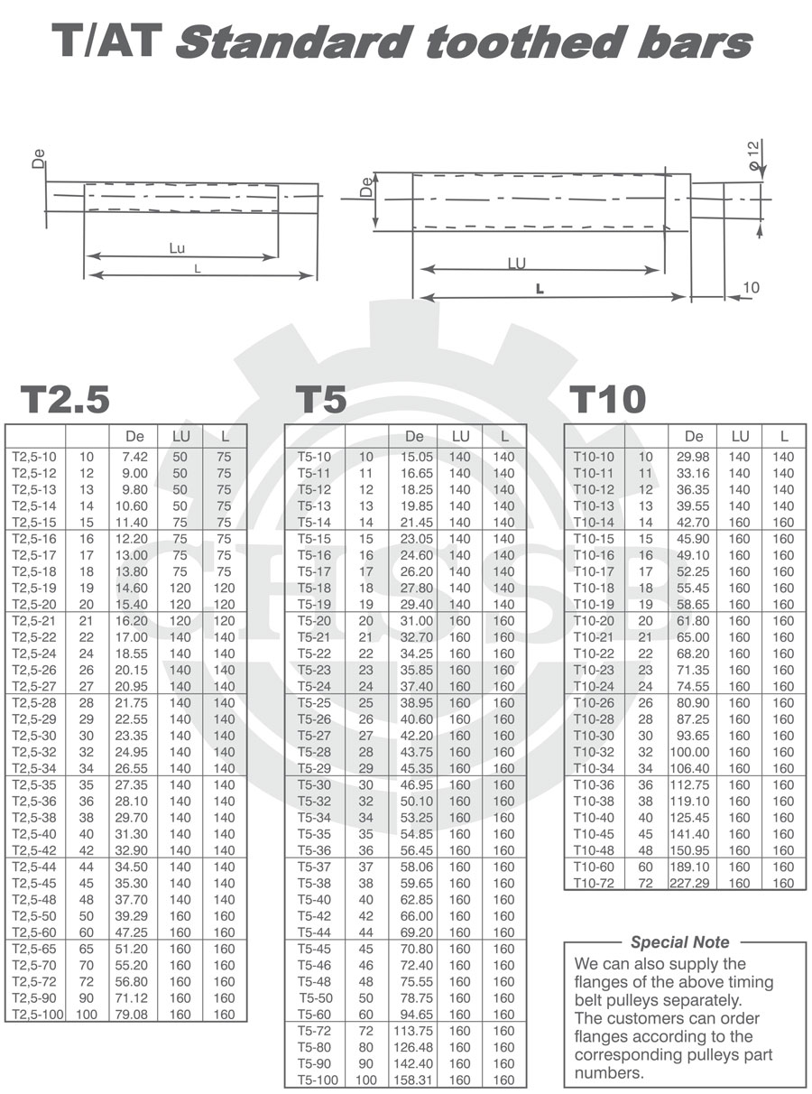 產品范圍: 美標/歐標:(T2.5/T5/T10) 英制尺寸產品(適用于美標市場) 公制尺寸產品(適用于歐標市場) T/AT齒棒、圓弧齒、STD同步帶輪、圓弧齒齒棒