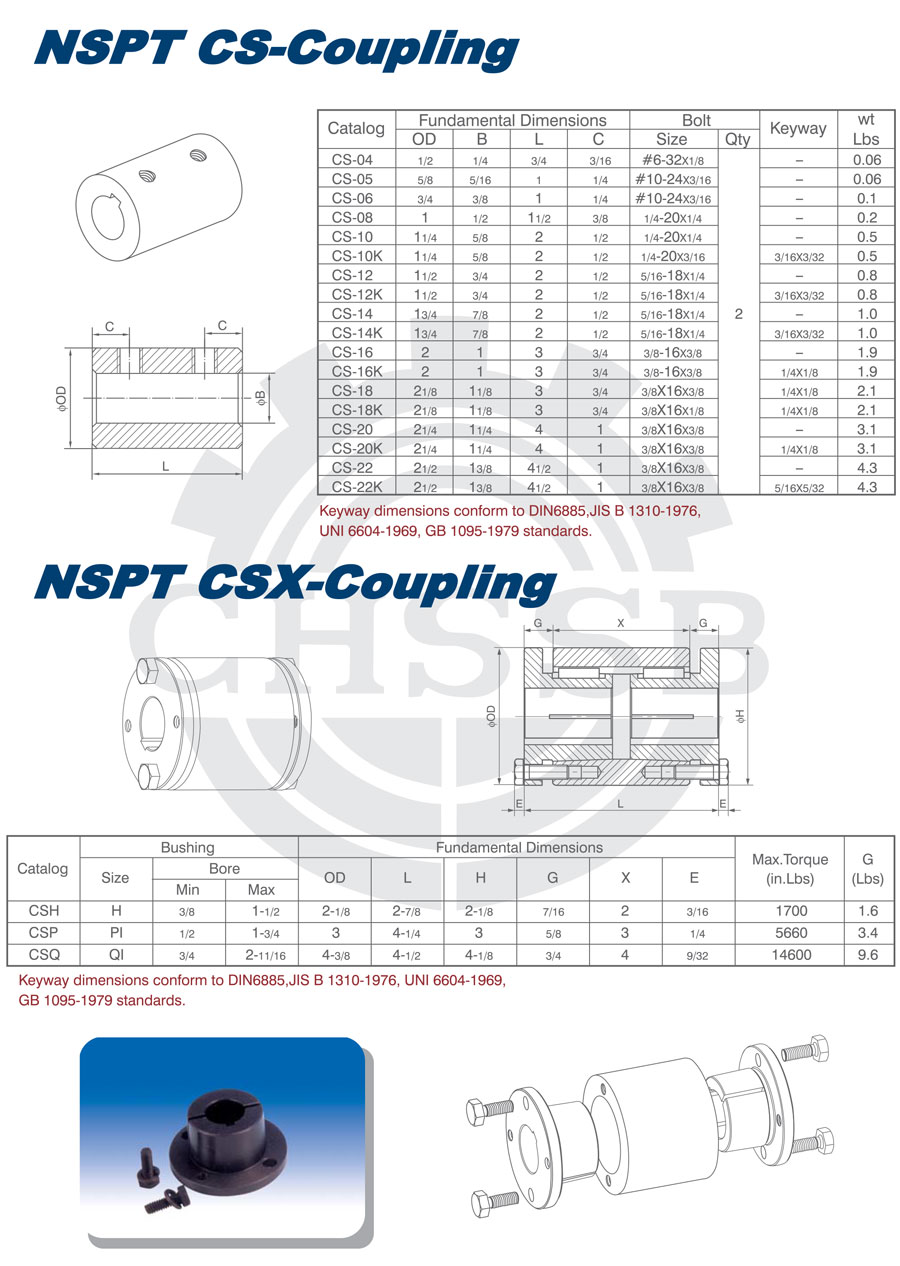 產(chǎn)品范圍: 美標/歐標:(CSH/CSP/CSQ) 英制尺寸產(chǎn)品(適用于美標市場) 公制尺寸產(chǎn)品(適用于歐標市場) CSX型聯(lián)軸器 CSH型聯(lián)軸器 CSP型聯(lián)軸器 CSQ型聯(lián)軸器